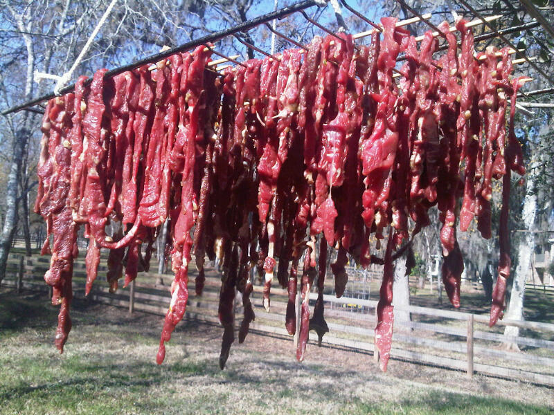 I am in Houston, Texas and it gets very hot and humid 9 months out of a year so timing is everything to make sin hang and it is more necessary to hang the meat outside and let the sun dry the meat better.  I have to make sin hang only during winter when the weather here is dry and cool (60 degrees day and 35 degree night and relatively dry).  No 'cage' necessary when it is that cool in Texas and thererfore no flies.  But occasionally there are bees hovering around I think it is because I have included honey as part of the ingredients.