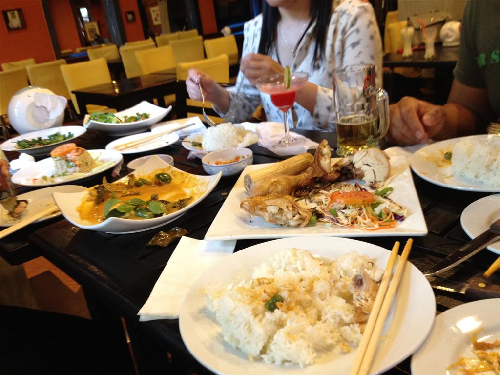 Everytime I ate, there was always food left on the table. This is normal for me in US but I think over there, they kind of think you are wasting food if you don't clean the plates. I sat next to some chinese folks and they ate everything they could, even the wiskers on the lobster. They looked at us like we were crazy to order so much food and not even finish half of it. I was going to ask them if they wanted to finish our leftovers but that would have been rude of me, haha. I noticed also when we went to eat with some real Lao people in Vientiane that they would say things in a very polite way such as when they wanted to take the leftover food home from a restaurant. They would say can you wrap this up for me to take home for my dog, even though they didn't have any pets. Actually, the story goes like this; a man that frequents a restaurant would ask the waitress to place the leftover food in a take out container so he could take it home for his dog. Well one day when his wife came to eat with him, the waitress asked him if he wanted to take the leftovers back to his dog that day and his wife asked her husband, we don't have a dog? So basically he was bringing the food home to his wife but instead of saying it directly, Lao people like to say things in a more elegant way, so I was told. There are a lot of phrases like this that play on words cause Lao people don't really want to be too direct, it is impolite. I however, don't ever take food home in a doggy bag at a restaurant.